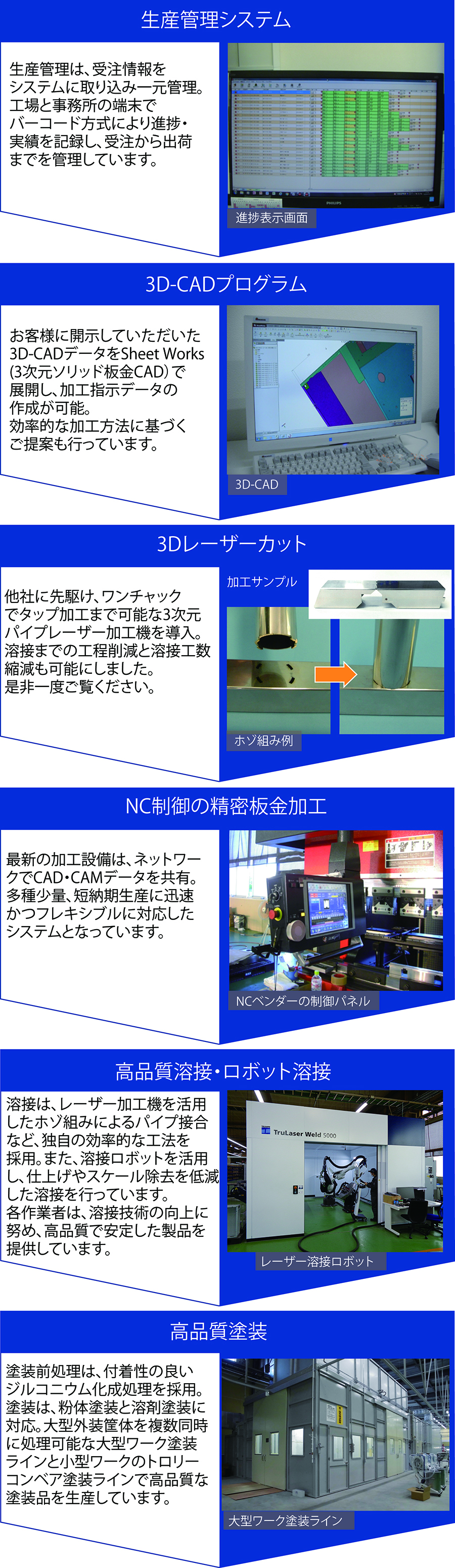 事業内容 ◆精密板金加工・溶接組立・金属焼付塗装 当社では、主に半導体製造装置や印刷機械・通信機器の筐体・フレームや部品を製造 しています。お客様のニーズに対し、蓄積したノウハウを活かして最適な加工方法をご 提案します。 ◆メッキ・酸洗等の表面処理(協力会社にて処理後に納品) 表面処理までの一貫生産に対応いたします。 当社の特長 工程フロー (ボタンをクリックすると画像または動画が表示されます) ▼受注 ▼プログラム SheetWorks(3次元ソリッド板金CAD)等で展開し、加工指令データを作成 ▼板材の抜き加工 TruMatic 6000 fiber、TruLaser 5030 fiber でレーザーカットと塑性加工 ▼パイプ・型鋼の切断・穴あけ・タップ加工 3D FABRI GEAR 220Ⅱ でレーザー・タップ加工 ▼バリ取り AuDeBu1000他でバリ除去 ▼タップ・皿・カシメ加工 CTS900NTでNC加工、カシメ機等で加工 ▼曲げ加工 HDS1703NT他で加工 ▼溶接 SS材、ステンレス、アルミ溶接 ▼板金検査 ▼表面処理 塗装、メッキ、酸洗い等 ◆出荷